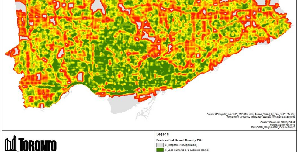 A network-wide medium level risk to extreme rain events is observable in Toronto. This risk is expected to increase with an increased incidence of extreme rain events and a declining quality of pavement. The maps show which areas might require a higher level of attention and allocation of funding.